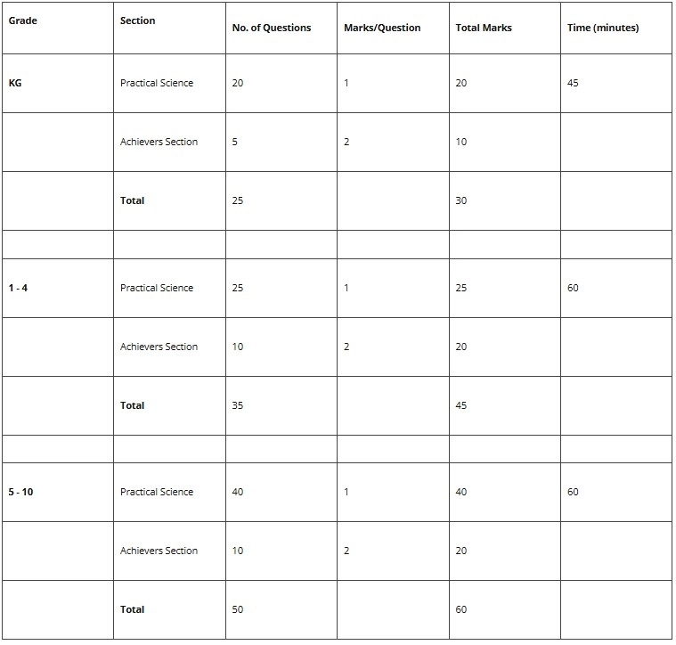 KG to 10 Online Through school & individually KG - 45 minutes, Grades 1-10 - 60 minutes Multiple Choice Questions (MCQs) 2 levels for all grades